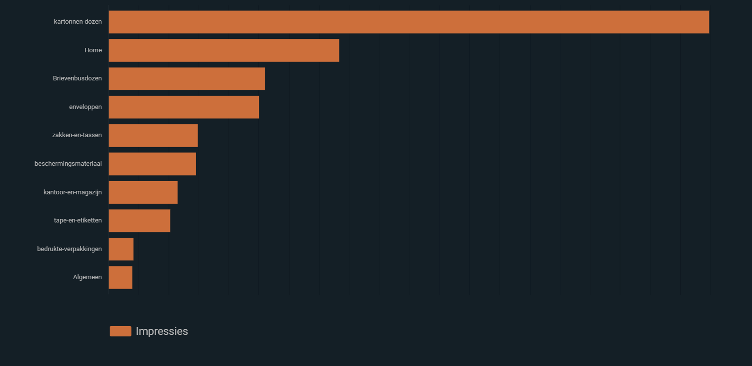 Uit die analyse werd duidelijk welke categorieën al bereik hadden in zoekmachines. Elke keer dat het domein zichtbaar is in een zoekopdracht in Google, is een impressie. Hoewel je uit impressies niet direct zoekvraag kan afleiden, geeft het wel een beeld over welke onderwerpen vaker gezocht worden dan andere. Dat geeft een startpunt: niet omdat die categorieën automatisch het belangrijkst zijn, maar omdat daar al vraag zit die je verder kunt uitbouwen.